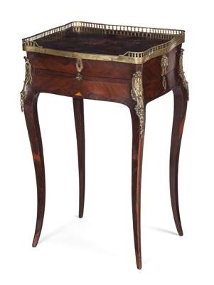 with gilt metal mounts, the hinged shaped rectangular top with a three quarter pierced brass gallery enclosing floral marquetry, opening to a void interior, above a long drawer and another lateral, raised on square tapered cabriole legs