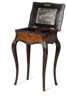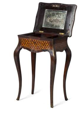 the inlaid rectangular top with brass bound serpentine edges opening to reveal an interior fitted with a mirror and lift-out tray, above a deep apron with corresponding inlay, raised on square tapering cabriole legs