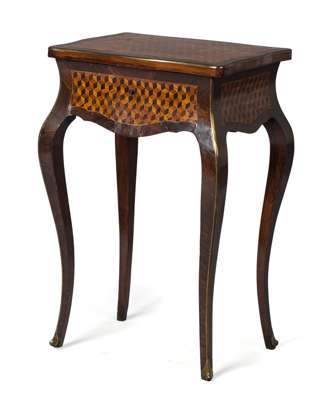 LOUIS XV STYLE WALNUT AND PARQUETRY INLAID WORK TABLE