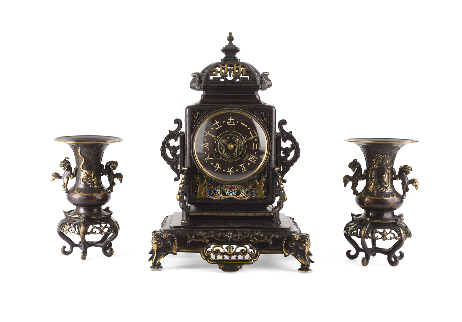 FRENCH CHINOISERIE PATINATED AND GILT BRONZE AND CHAMPLEVE THREE PIECE CLOCK GARNITURE