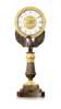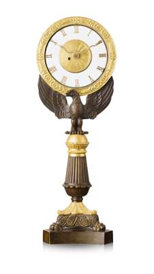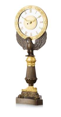 the glass dial with gilt metal Roman numerals and snake form hands, within a moulded circular frame, raised on a column with an eagle perched on a reeded baluster column and tripod base with three paw feet