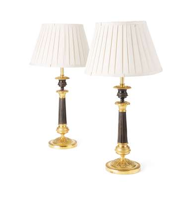 PAIR OF RESTAURATION PATINATED AND GILDED BRONZE LAMPS