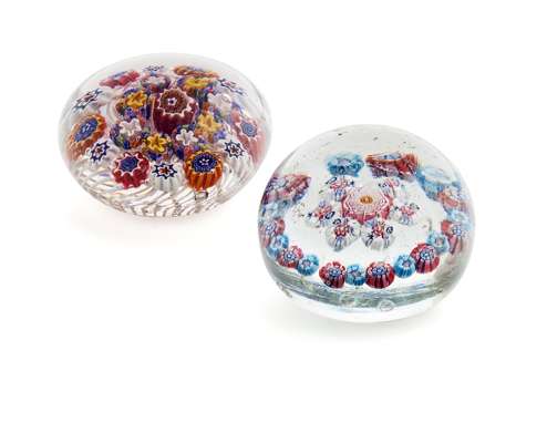 the first, with a suspended central flower comprised of seven canes within a millefiori border, 5.5cm diameter; the second, with a similar design of millefiori canes above white latticino, 6cm diameter (2)