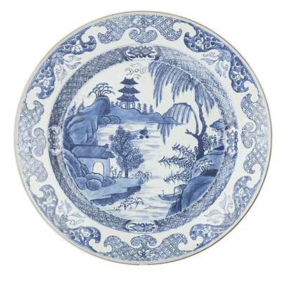 comprising a charger and six plates decorated with a temple in a landscape; a pair of plates painted with flowering baskets; and a plate painted with foliage, with an artemisia leaf mark to the underside (10)