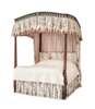 the oak leaf painted arched canopy frieze with a floral tassled apron and pleated pink floral hangings, raised and stiff leaf carved upright supports, ending in tapered legs with block feet