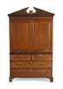 with later line inlay, the arched dentil moulded cornice above a pair of fielded panel doors enclosing hanging space, the lower section with two small and two long drawers raised on bracket feet