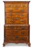 the moulded cornice above three short over three long featherbanded graduated drawers, flanked by fluted canted angles; the lower part with two short over two long featherbanded graduated drawers flanked by similar angles, on ogee bracket feet