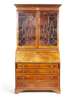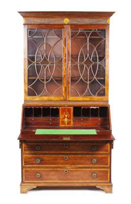 the straight cornice above a wide frieze inlaid with fan motif above a pair of astragal glazed doors opening to shelves; the lower part with a slant front opening to a baize lined writing surface and an arrangement of pigeon holes and drawers, above four graduated long drawers raised on bracket feet