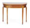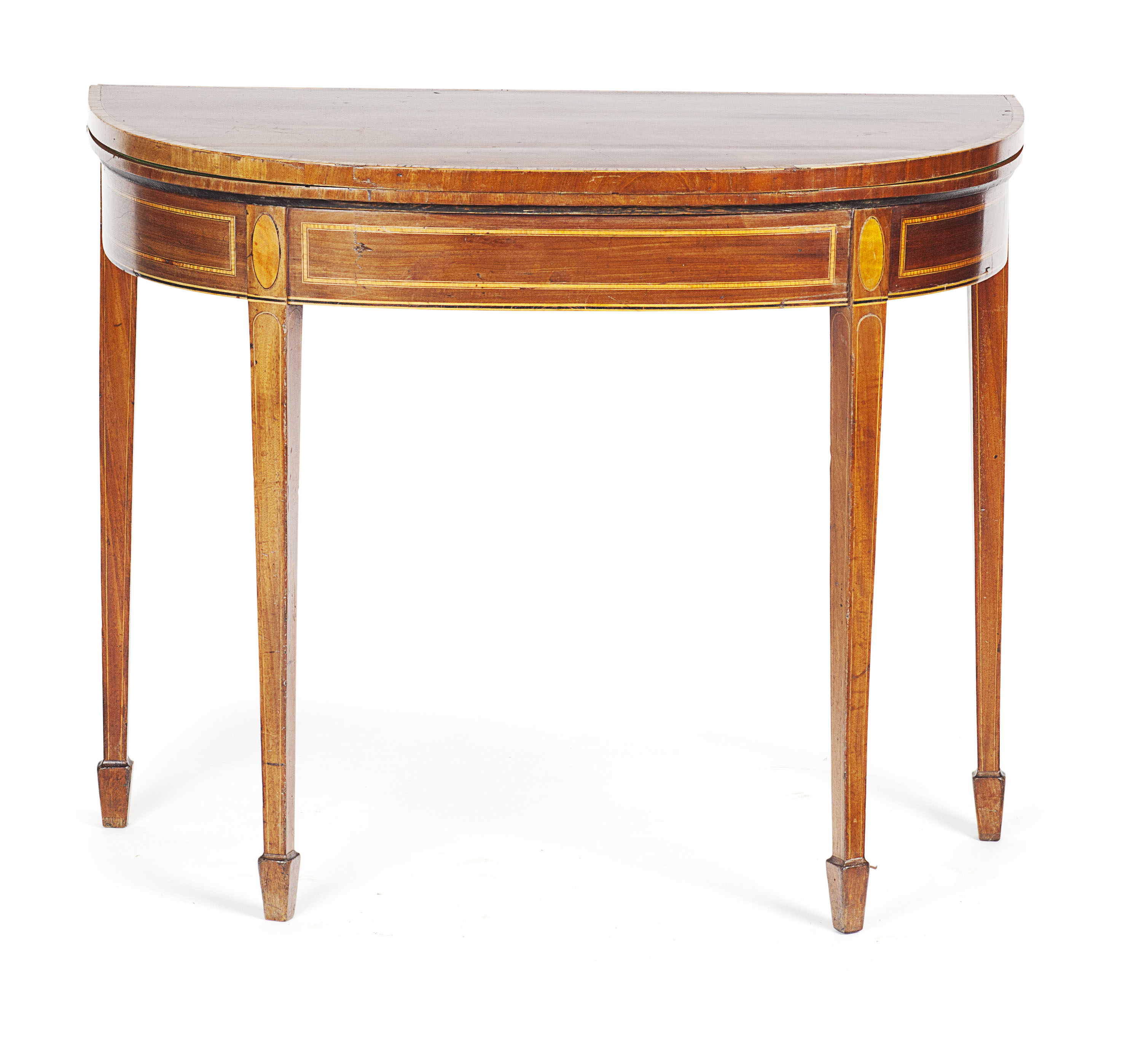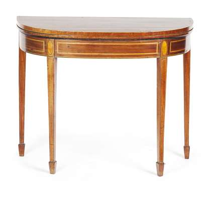 GEORGE III DEMILUNE MAHOGANY AND ROSEWOOD FOLDOVER GAMES TABLE
