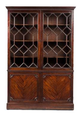 the moulded fluted cornice above a pair of astragal glazed doors opening to shelves, over a pair of moulded cupboard doors on a plinth base