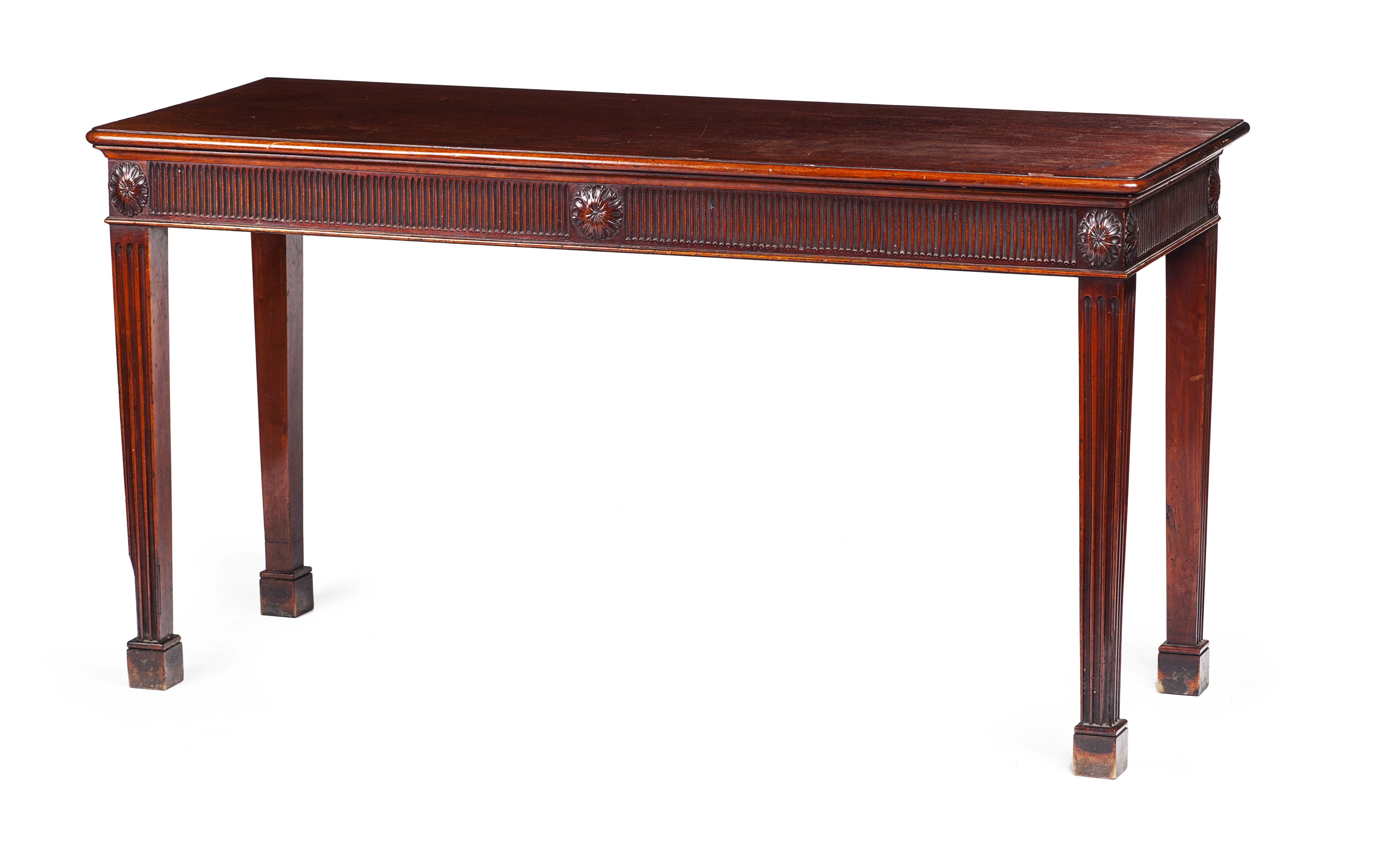 the rectangular top over a fluted frieze centred by a carved paterae and raised on square tapered legs headed by further paterae and ending in spade feet