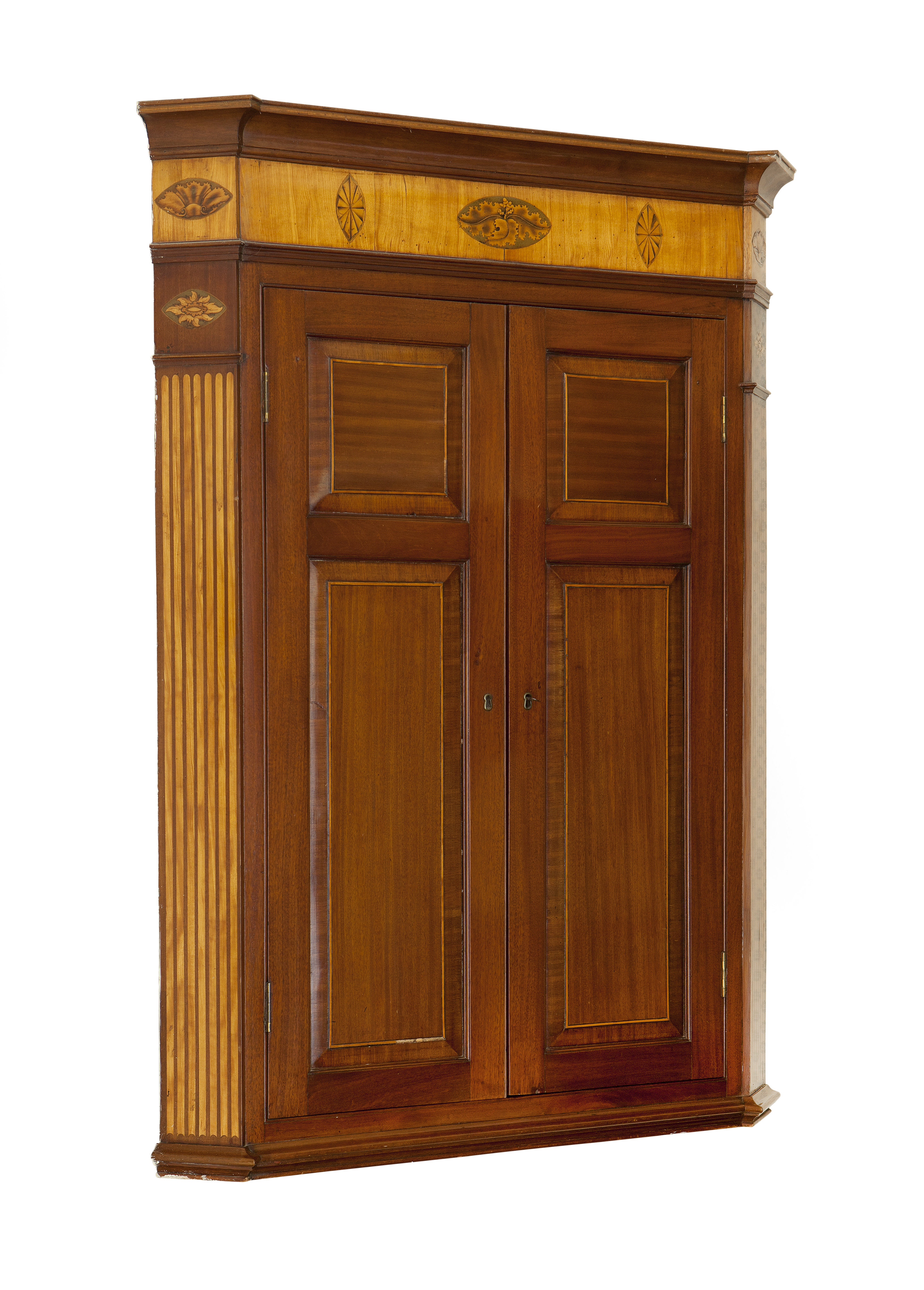 the moulded cornice over a frieze inlaid with shell and fan motifs, above a pair of panelled doors, flanked by inlaid 'fluted' canted corners