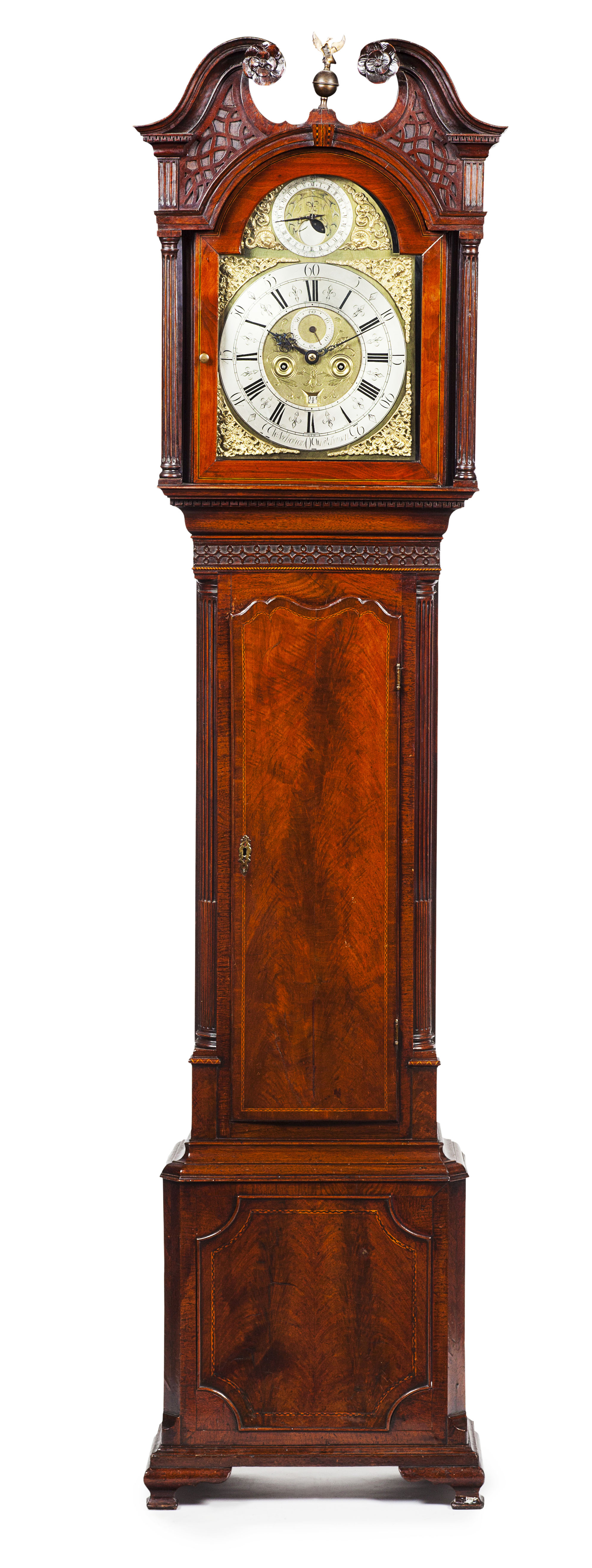 the swan neck pediment over an arched brass dial with a moon phase dial and subsidiary seconds and date dials above a silvered brass Roman number chapter with a seconds dial and date aperture pierced spandrels flanked by fluted columns; above a blind fret carved frieze and shaped trunk door flanked by stop fluted quarter columns, on a moulded plinth base with ogee bracket feet