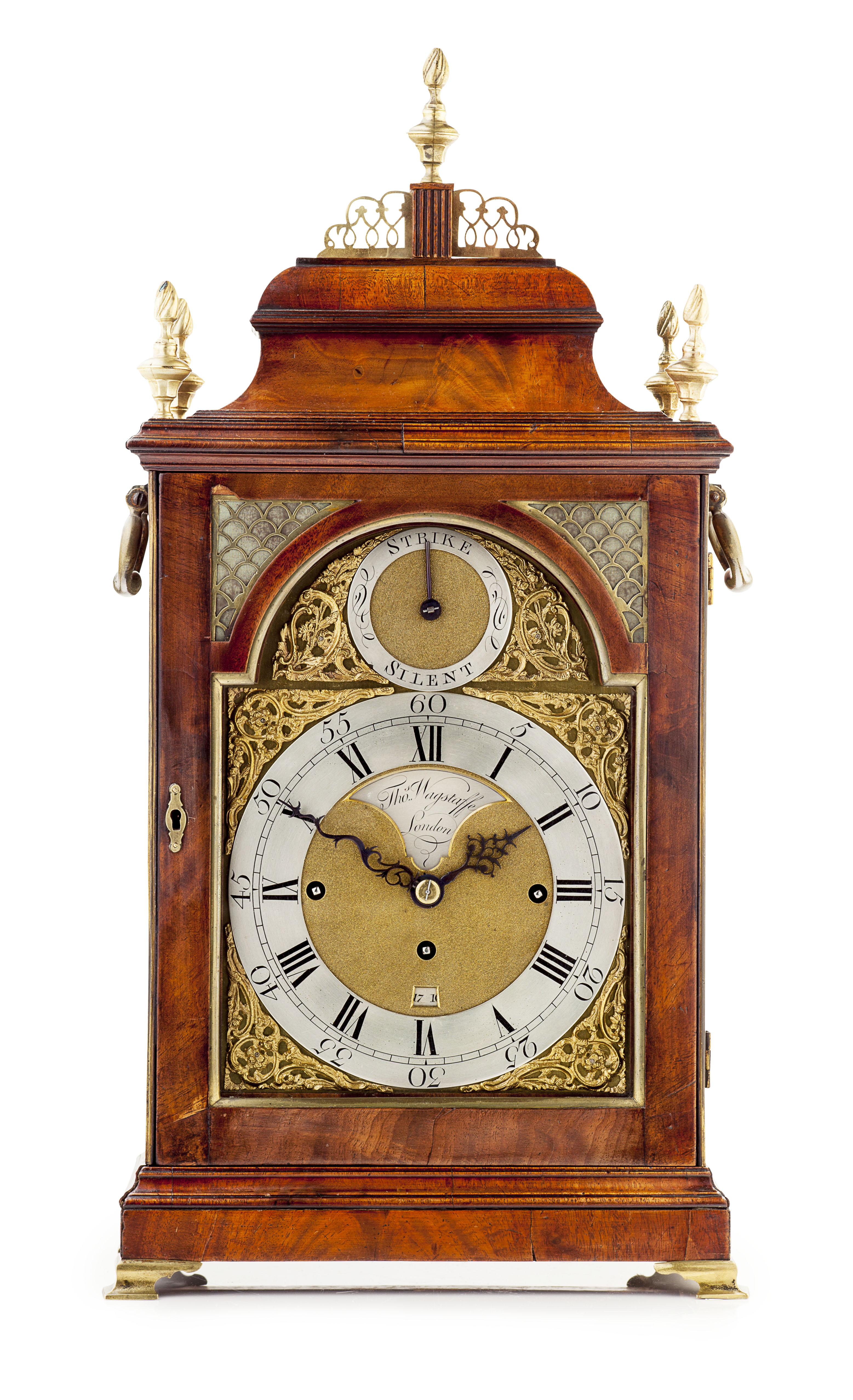 the bell top case with brass urn finials above a silvered dial with Roman and Arabic numerals and a Strike/Silent subsidiary dial and dater aperture, signed 'Thos Wagstaffe / London', with pierced brass spandrels and side frets, raised on brass ogee bracket feet; the eight day movement striking a bell
