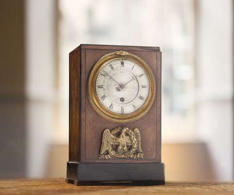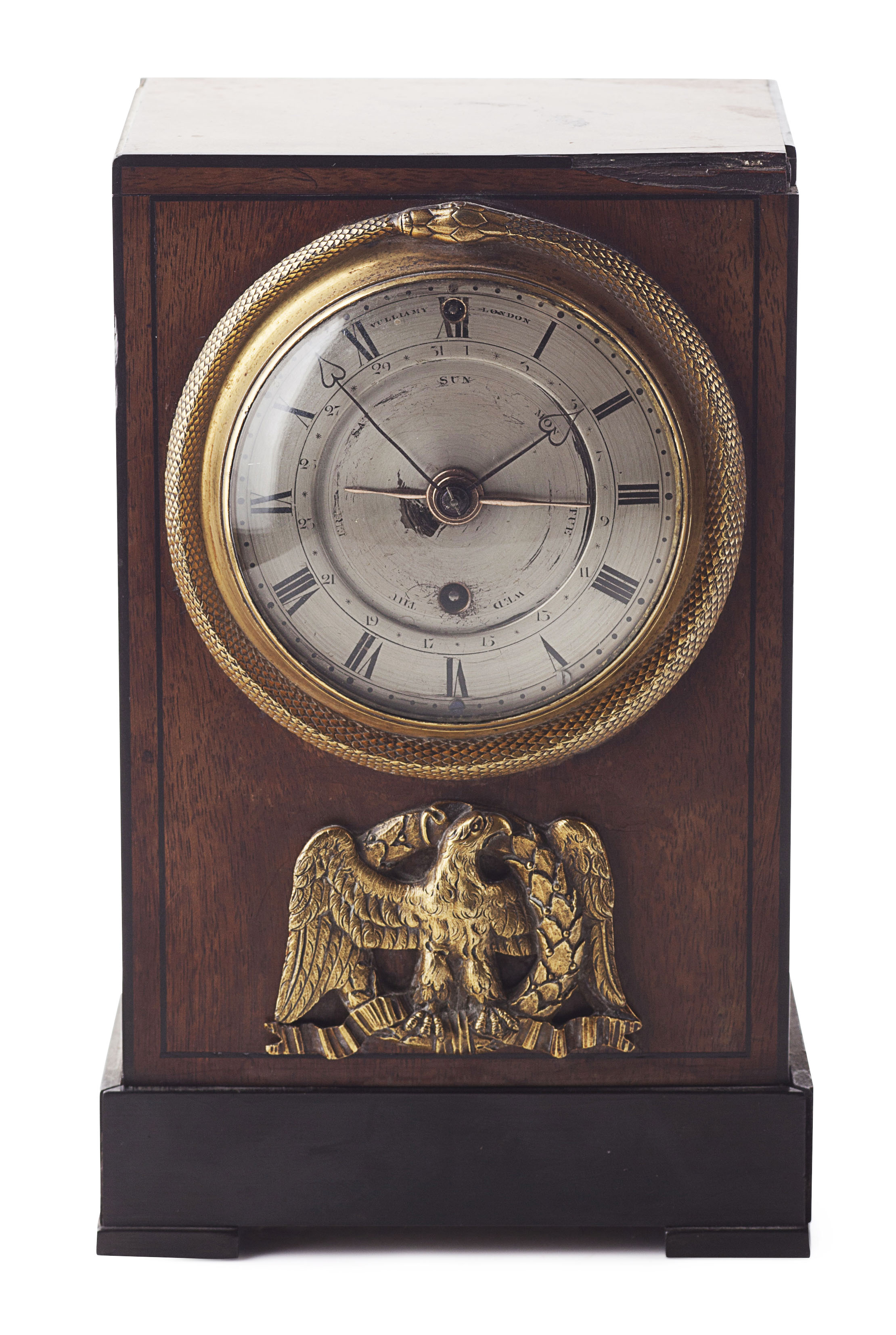 the circular silvered Roman numeral dial with calendar day/date chapters and inscribed 'Vulliamy / London', in a gilt metal circular bezel cast as a serpent biting its tail, in a rectangular rosewood case with ebony banding and a gilt metal cast eagle mount, on an ebony plinth base; the back plate engraved 'Vulliamy / London'