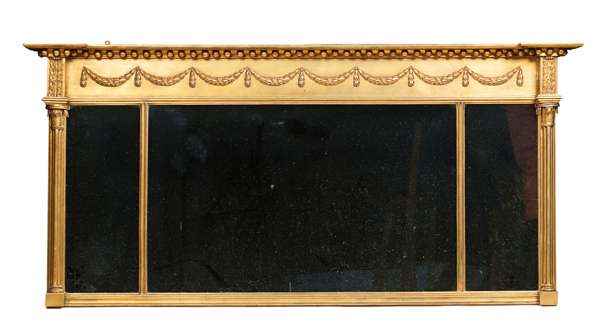 the breakfront cornice above a bead moulded frieze with laurel swags, over a divided rectangular mirror plate flanked by triple cluster columns with palmette capitals