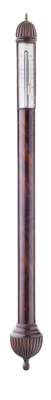 with a signed silvered vernier scale, the bow fronted case with reeded domed pagoda top and urn finial, corresponding bulbous base with lotus leaf pendant