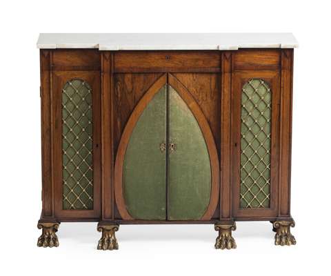 the breakfront white marble top above a long frieze drawer and a pair of moulded doors with green velvet lining, flanked by cupboard doors with metal grille inserts raised on carved giltwood hairy paw feet