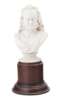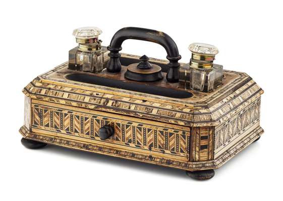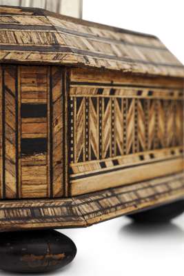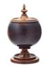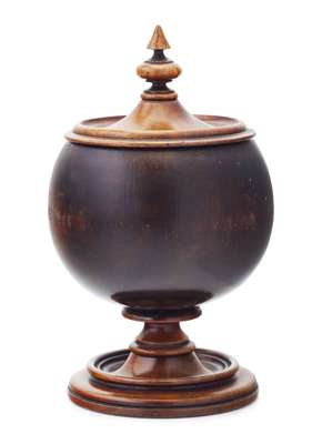 unmarked, raised on a turned wood pedestal; together with a TUNBRIDGEWARE DESK STAND, 29cm wide; and a TREEN WASSAIL CUP AND COVER, 25cm high (3)