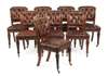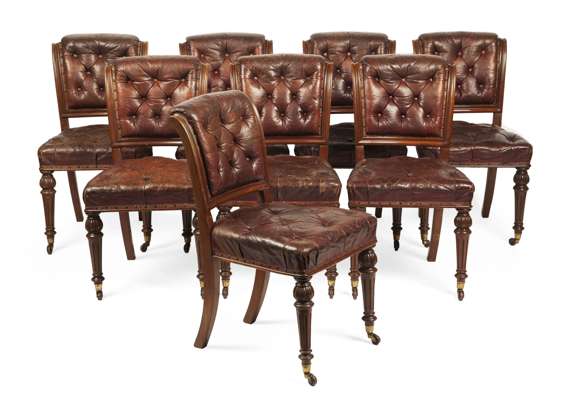 the padded button upholstered backs and seats covered in brown leather, raised on lobed and fluted tapered legs ending in brass caps and ceramic casters, one stamped on the hessian 'MACKENZIE & MITCHELL/ MANUFACTURERS/ EDINBURGH' (8)