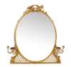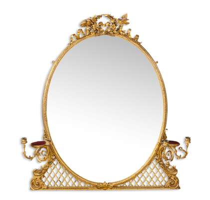 the oval mirror plate surmounted by a pair of doves, ribbons and floral spray cresting, within a guilloche moulded frame flanked by scrolling foliate candle arms and display shelf, above a trellis base