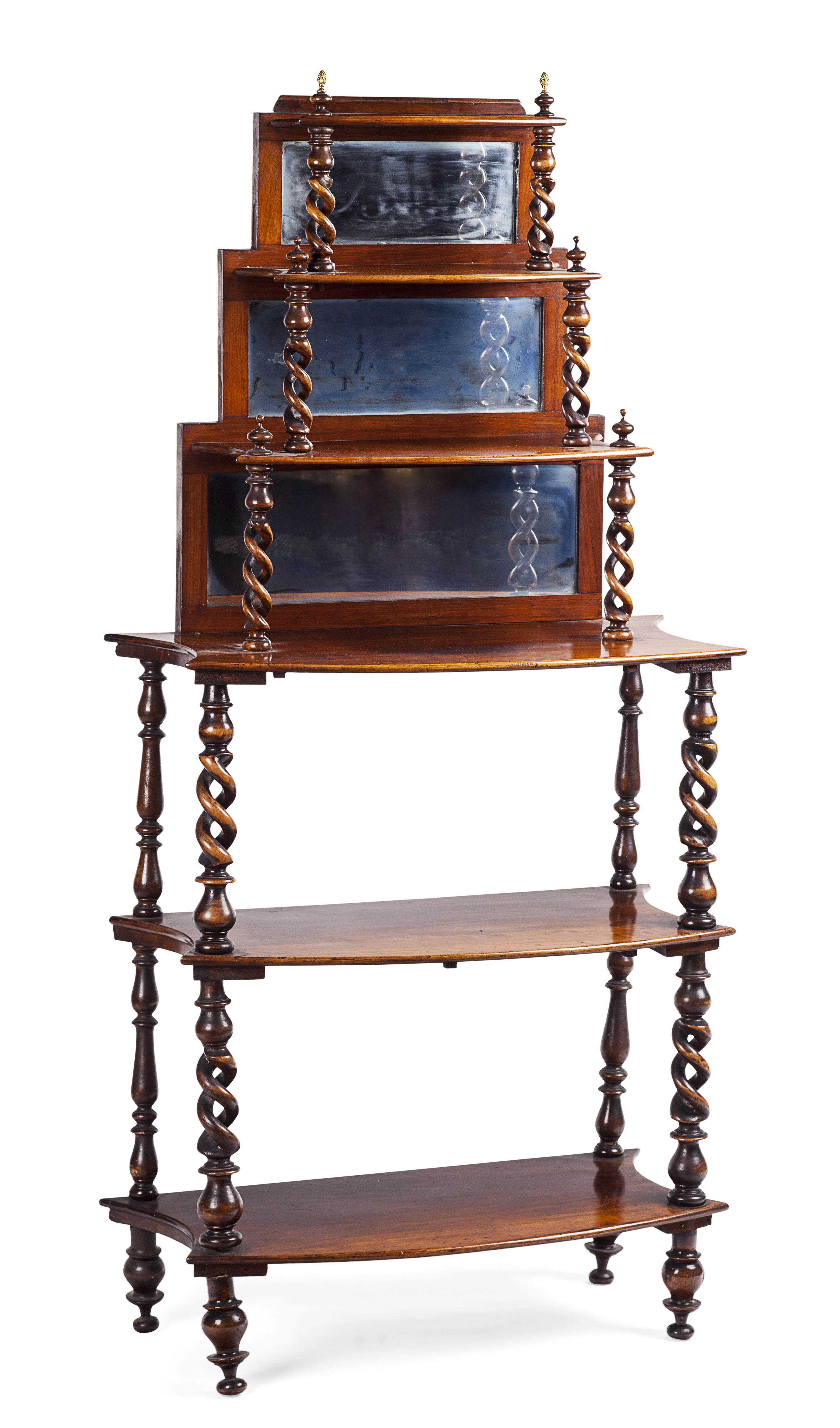 with three mirror backed tiers above two shaped shelves, raised and divided by open spiral turned and baluster supports, on turned feet