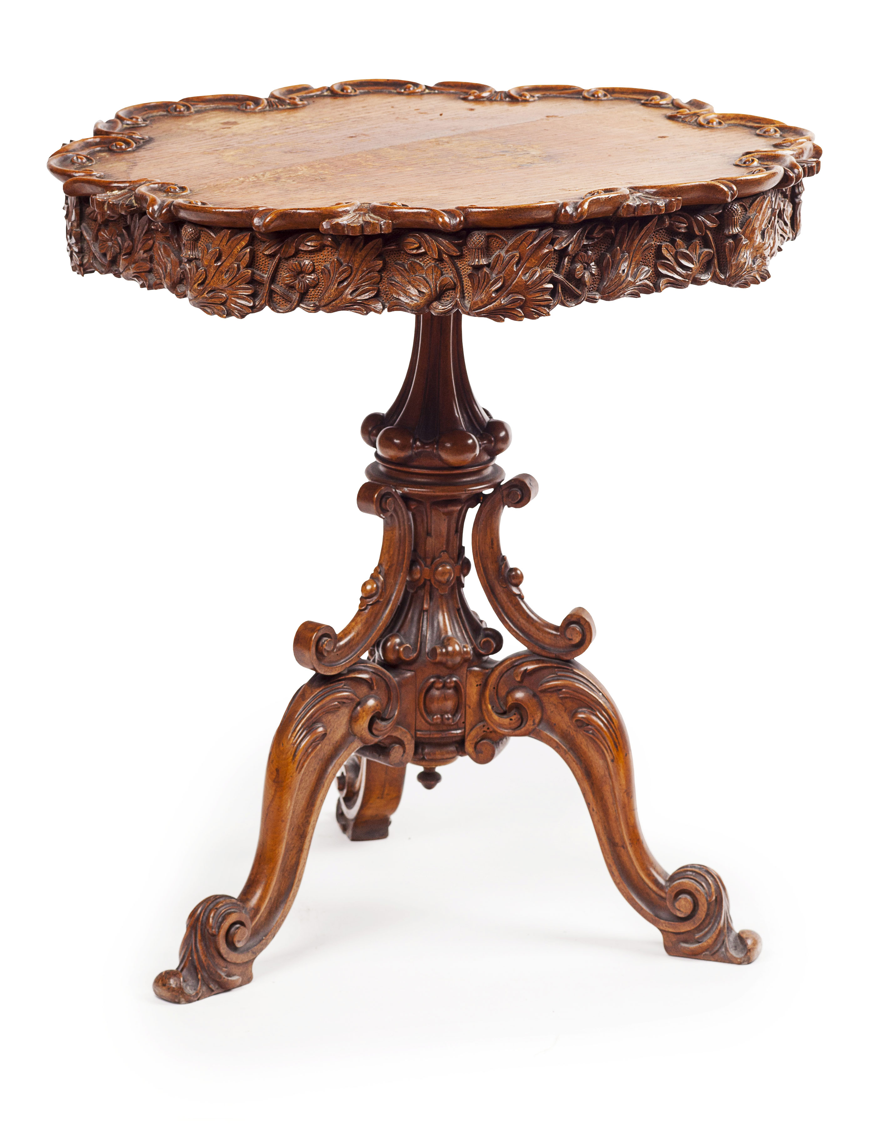 the circular top with a scroll moulded edge above a deep frieze carved with thistles, flower heads and scrolling leaves, on a carved column with C-scroll brackets and raised on acanthus carved cabriole legs