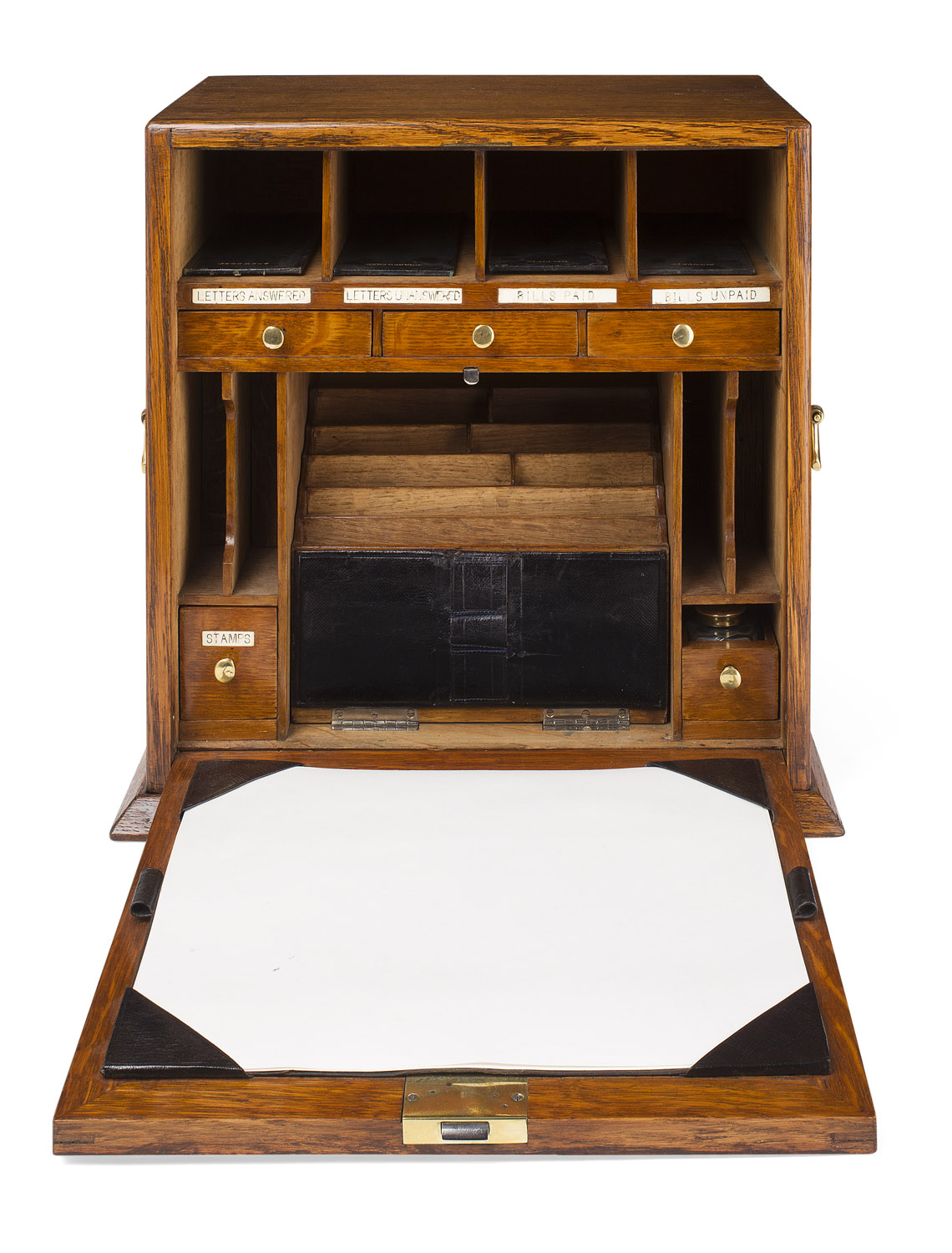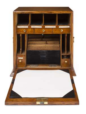 of rectangular form, with a fall front writing slope, fitted with a hinged stationery rack lined with leather pen holders and with two small drawers to the side, one with glass inkwell, another three small drawers and various other compartments above, with brass lock and handles