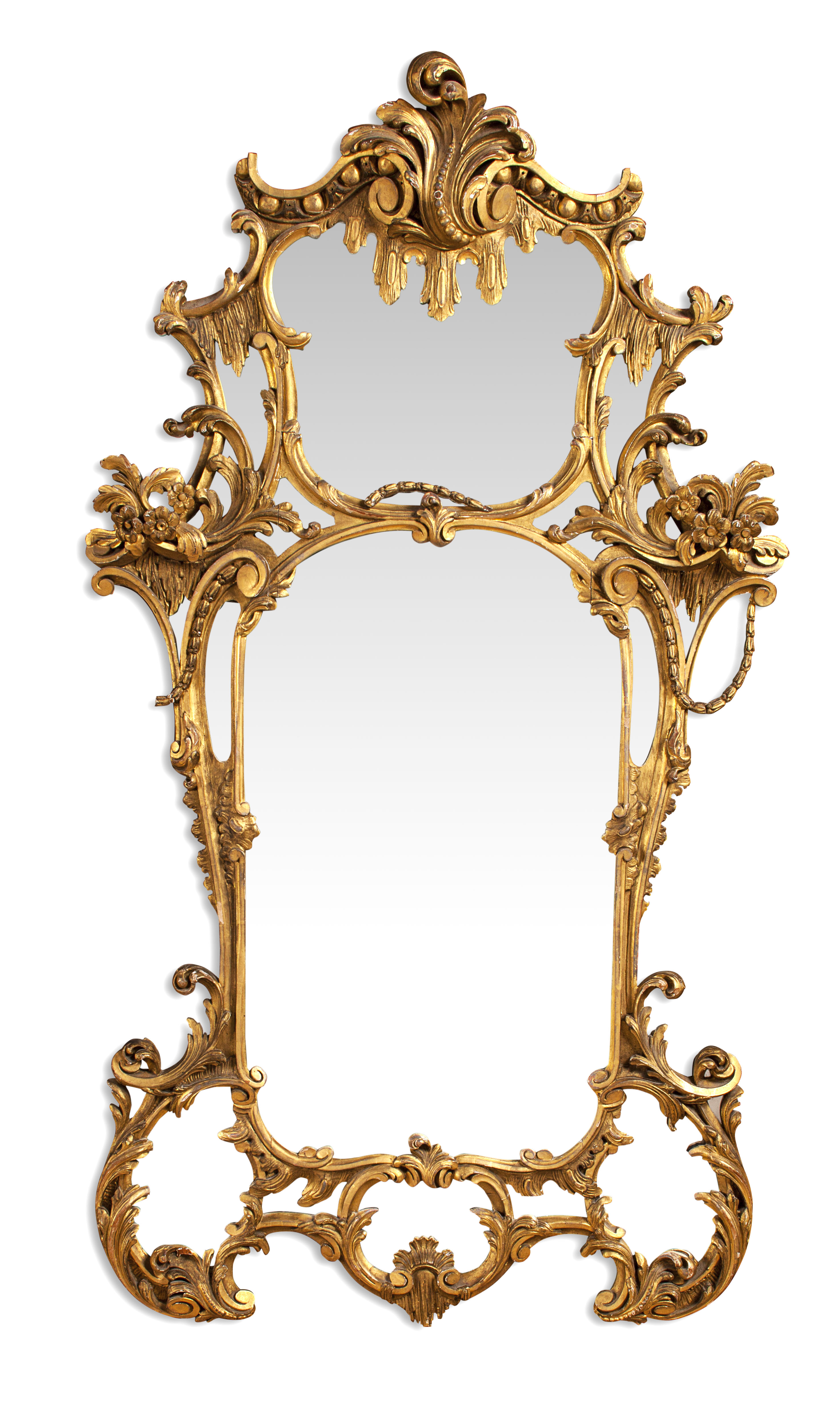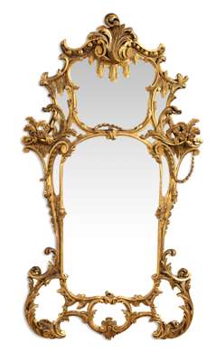 the shaped and divided mirror plate within an elaborate giltwood and gesso frame carved with C-scrolls, acanthus, flowerheads, trailing bellflowers and rockwork (2)