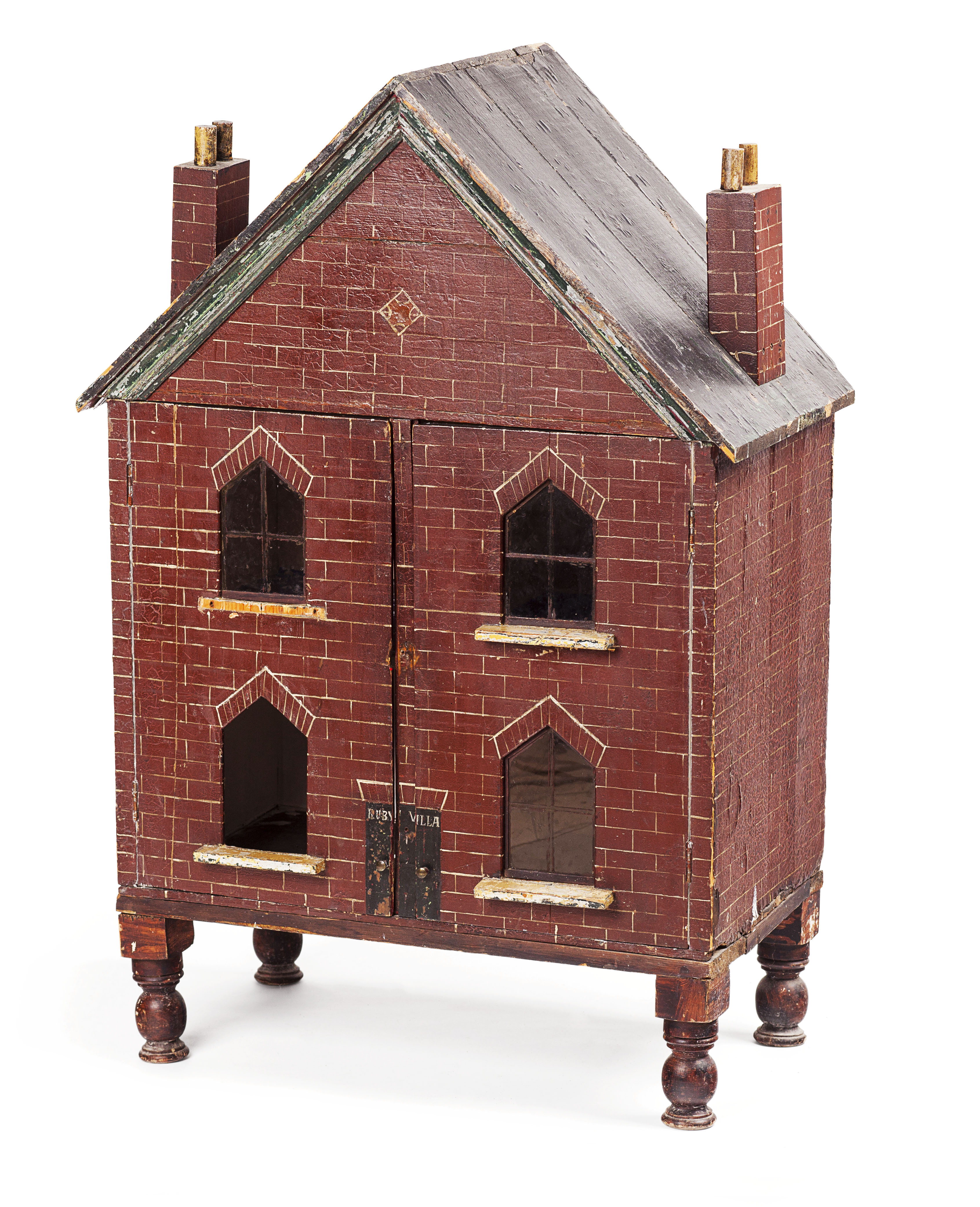 modelled as a brick house with a peaked roof and double chimney stacks, the front with four windows opening to a four room interior, raised on turned legs