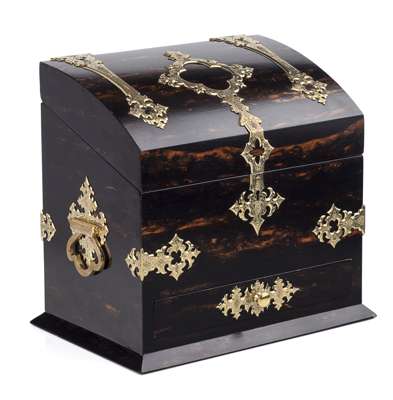the domed cover with elaborate brass strap hinges opening to a compartmented interior above a single base drawer, with further strap bands to the corners and brass loop handles to the sides