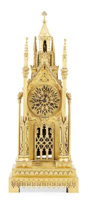 in the form of a Gothic cathedral with a bell tower and crocketted spires, on a stepped base, the eight day movement striking a bell