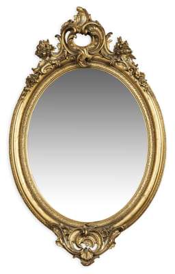 in the Rococo style, the bevelled oval mirror plate within a leaf moulded frame with C-scroll and foliate scroll cresting