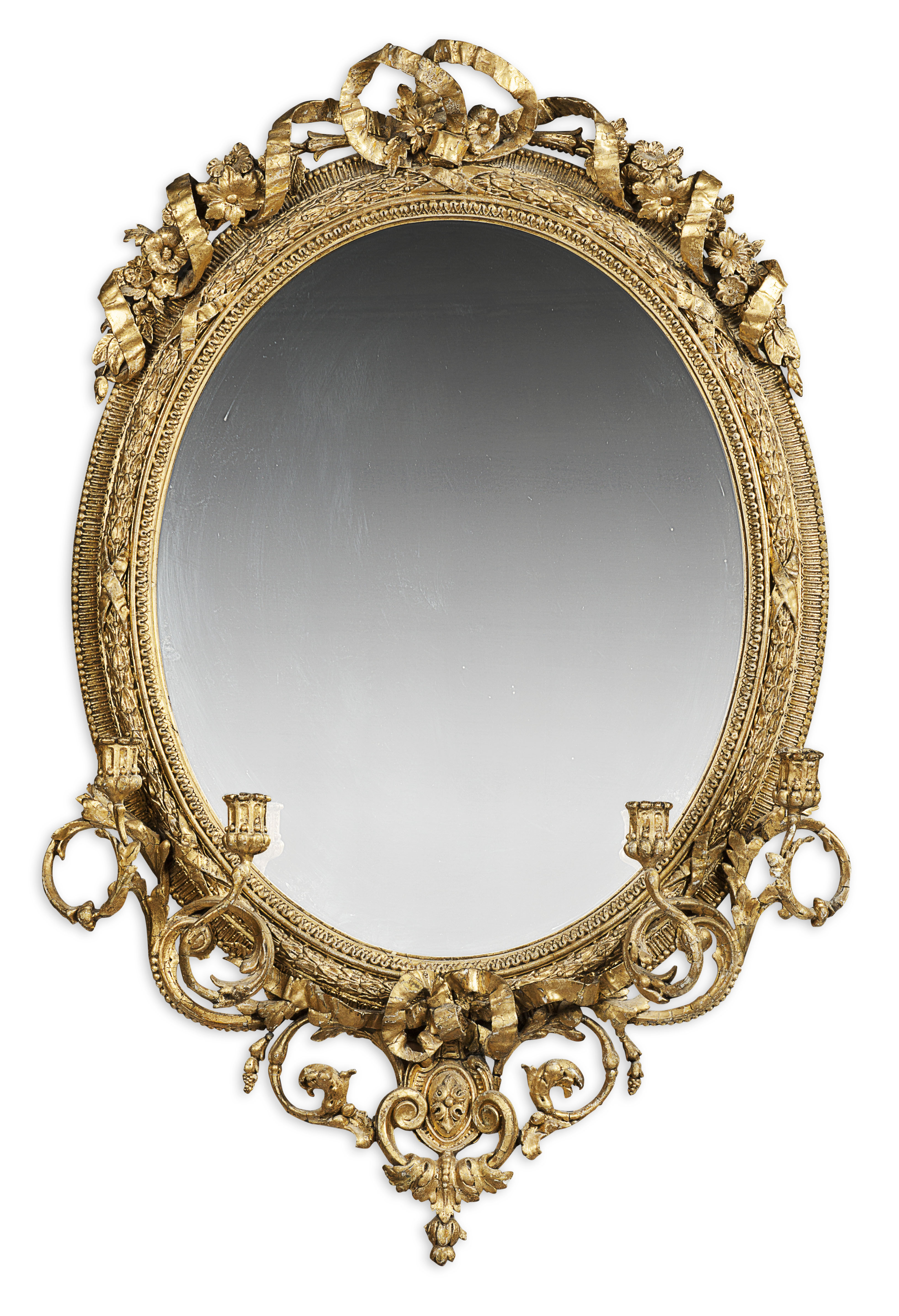the oval mirror plate within a leaf tip and laurel wreath banded frame with ribbon tied floral cresting and issuing four scrolling candle arms