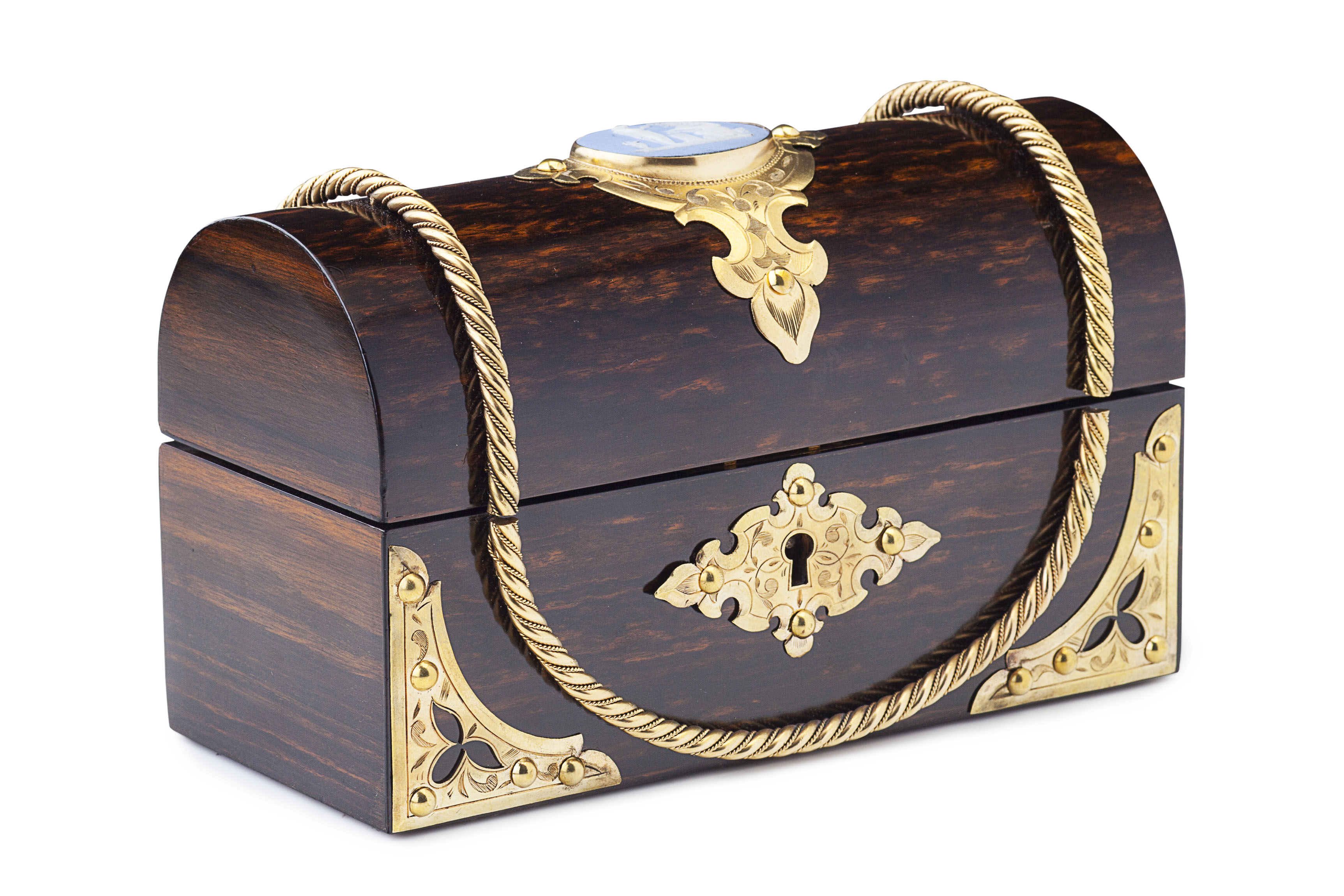 VICTORIAN COROMANDEL, BRASS AND JASPERWARE MOUNTED PERFUME CASKET