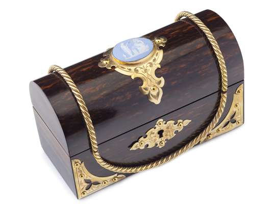 the domed lid inset with a jasperware plaque and brass rope-twist mounts, opening to reveal three cut glass perfume bottles