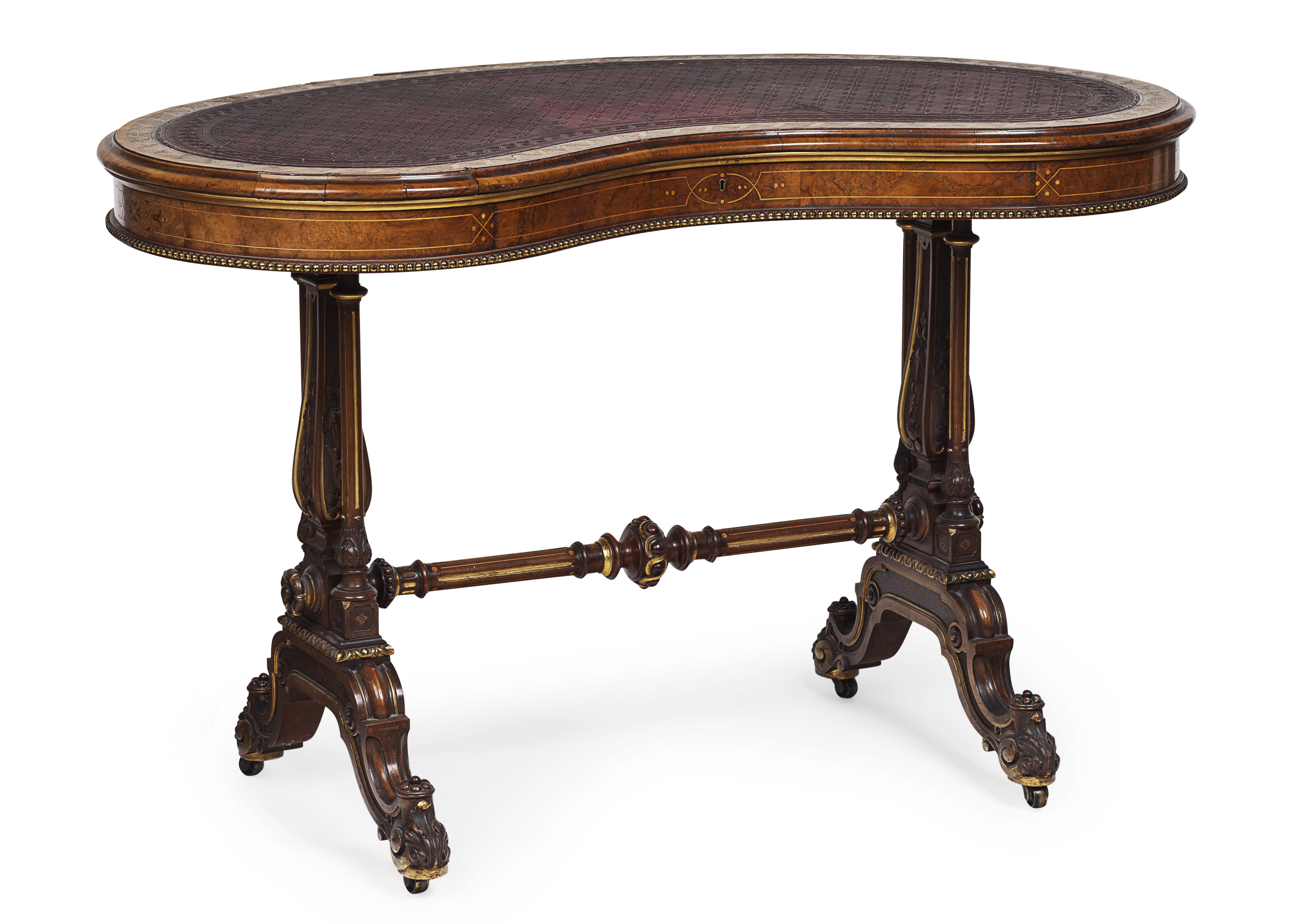 VICTORIAN WALNUT, MARQUETRY AND GILT METAL MOUNTED KIDNEY SHAPED WRITING TABLE