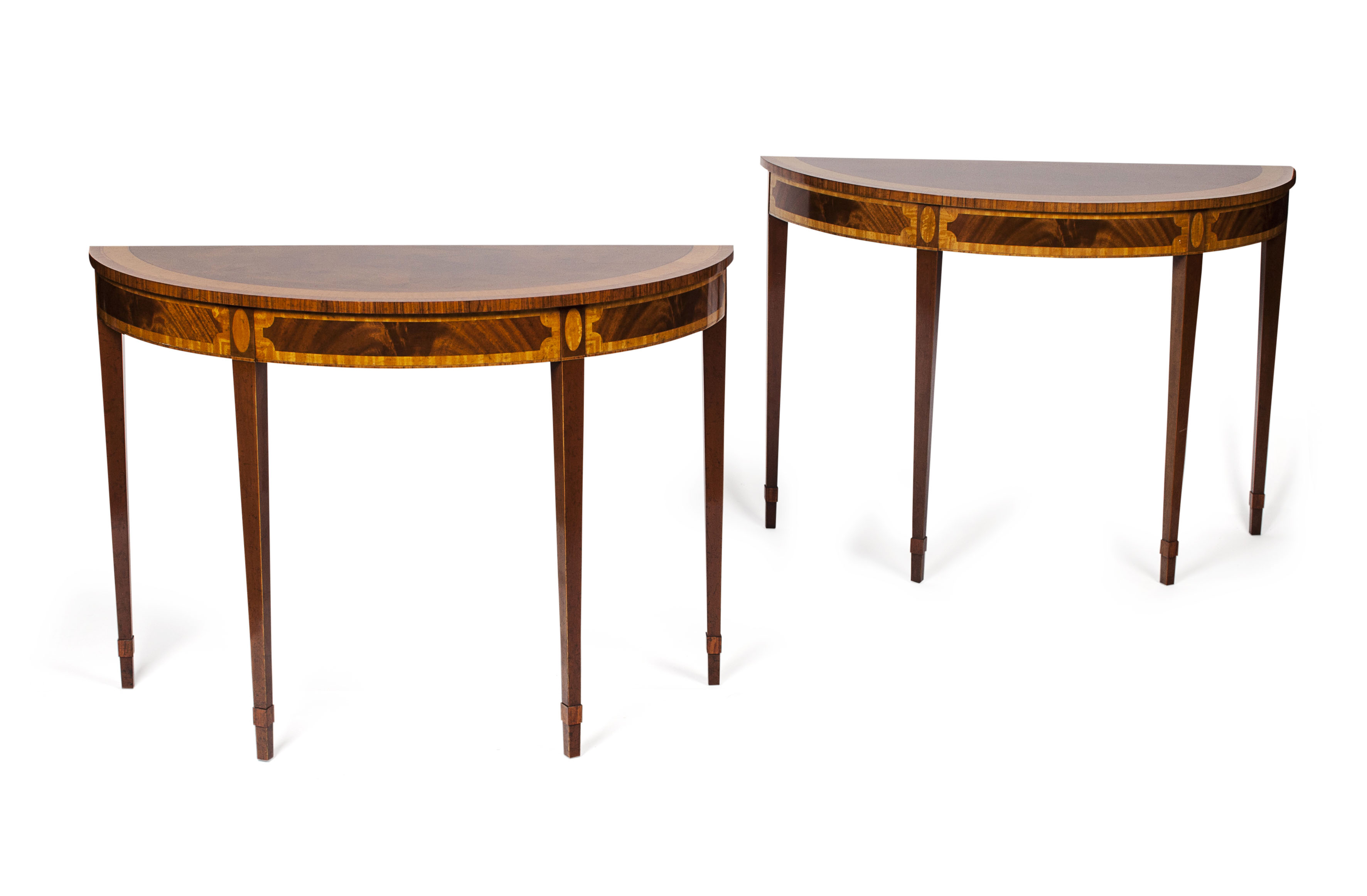 the demilune tops over crossbanded frieze raised on square tapered legs with collared feet (2)