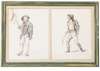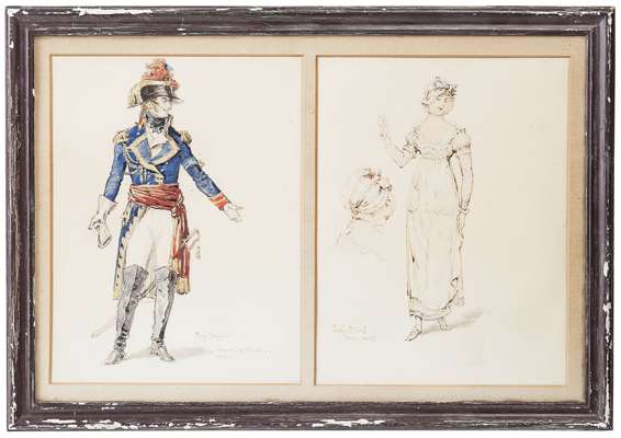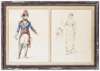 watercolour and pencil on paper, comprising twenty-two individual designs, most labelled and signed depicting late 18th and early 19th century characters and costumes; nine double framed, four single framed, (13)