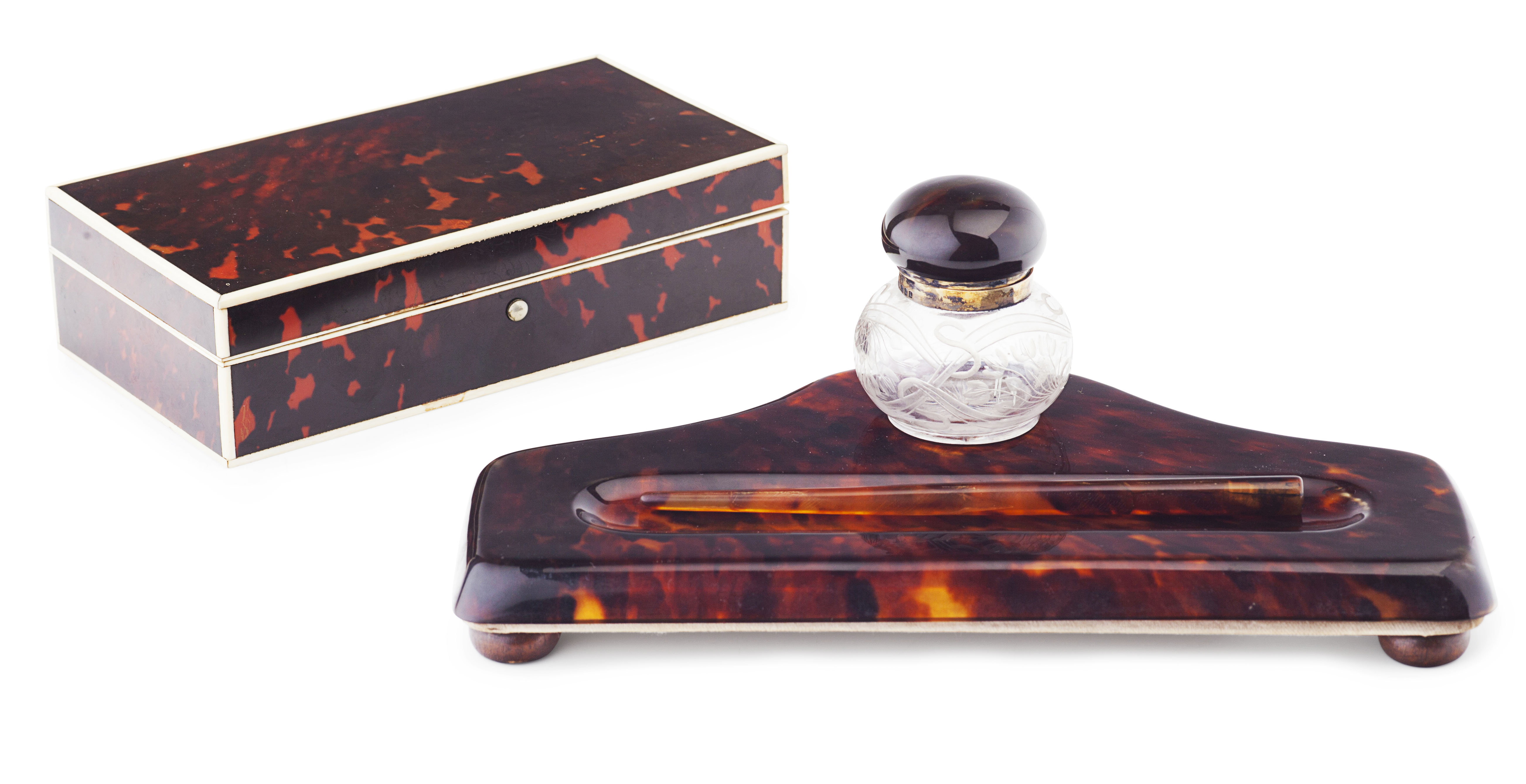 of rectangular form, the hinged lid opening to reveal a sandalwood interior, 19.5cm wide; together with a FAUX TORTOISESHELL INK STAND, with a pen tray, pen, and silver mounted cut glass ink well, hallmark CD, London, 1922, stand 26.5cm wide (2)