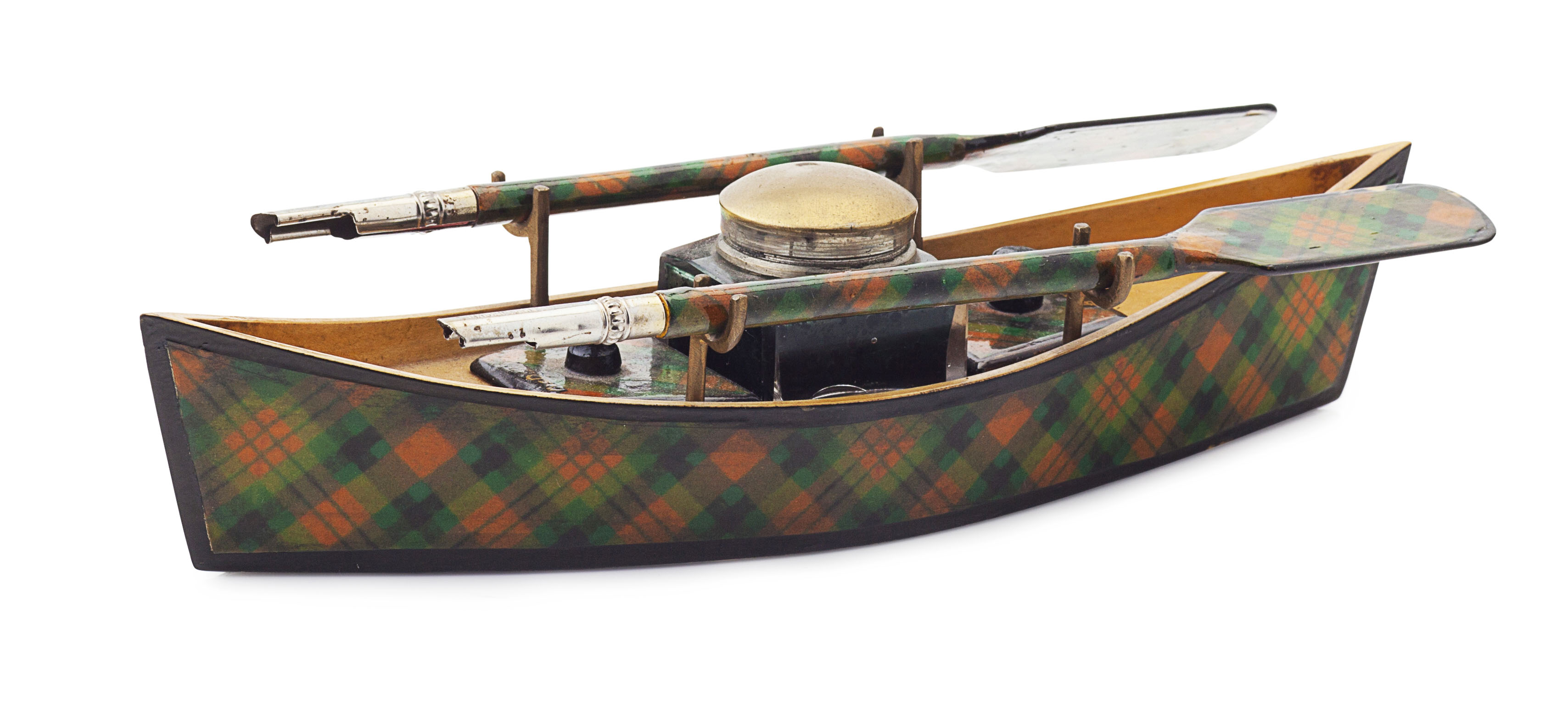 in the form of a canoe, with a cut glass inkwell and two covered compartments, the oars fitted for pen nibs, with painted inscriptions MACDUFF