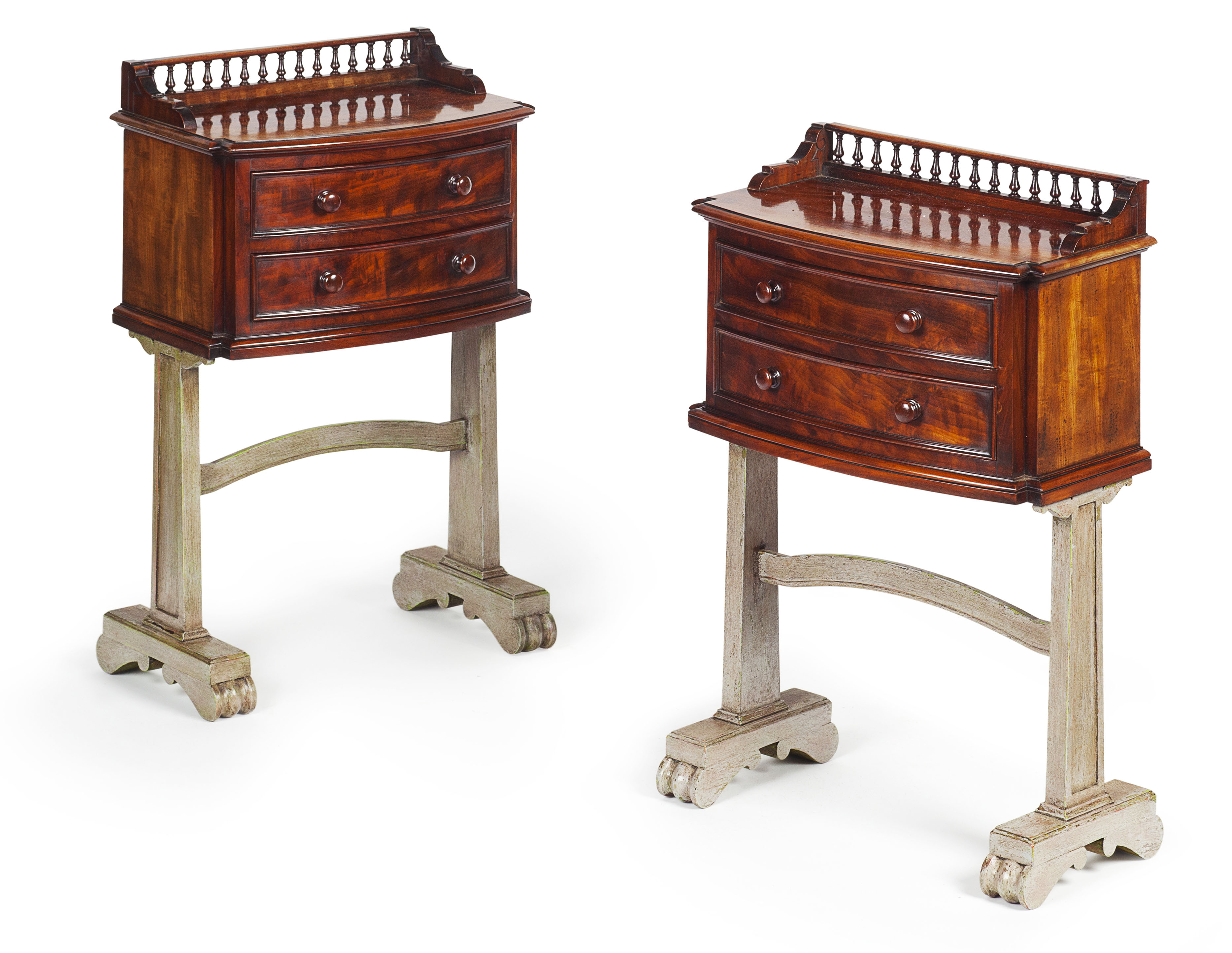 the bowfront tops with a three quarter gallery over two drawers, raised on white painted trestle supports joined by a curved stretcher (2)