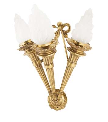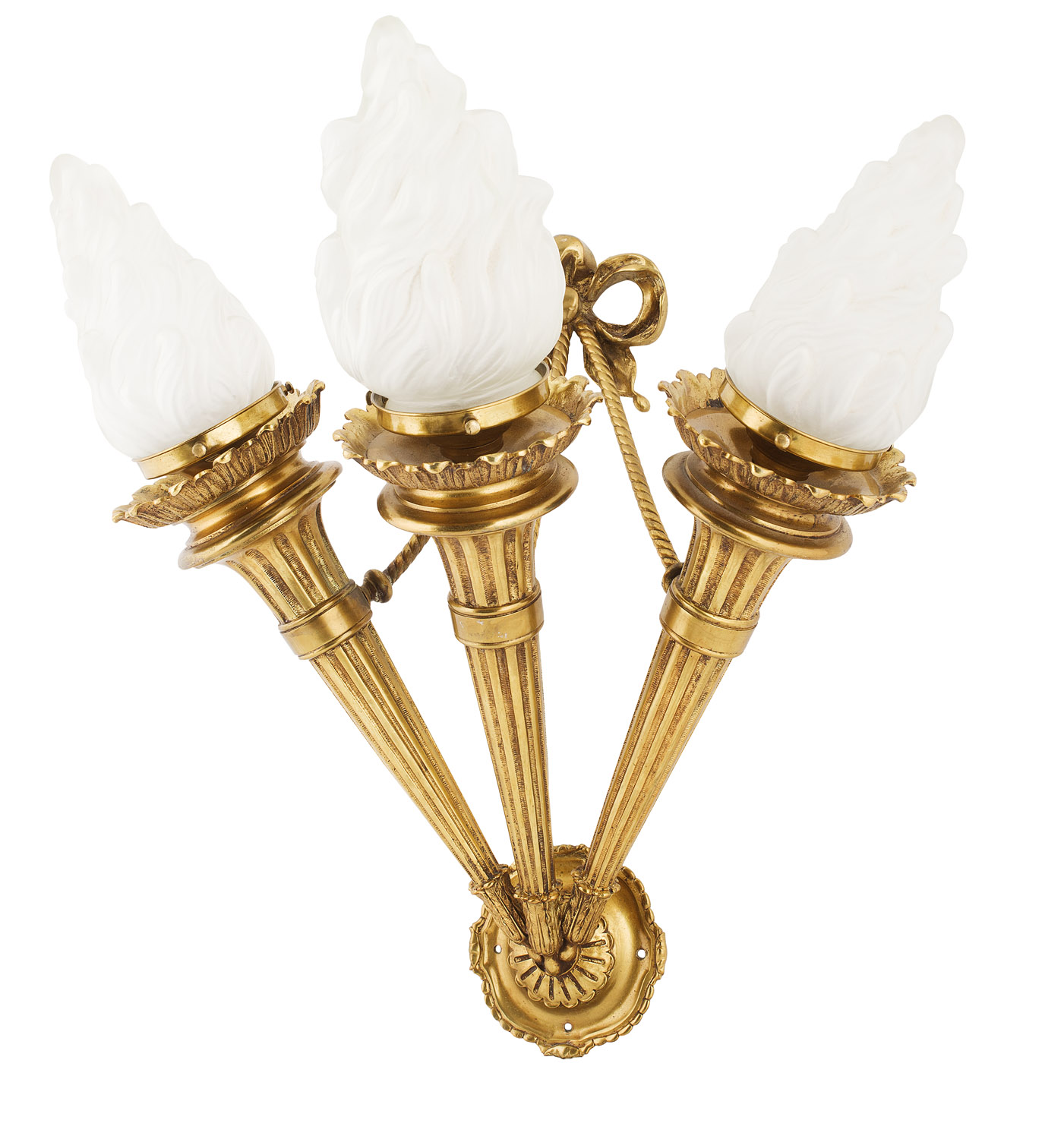 each comprising three ribbon-tied torches, with moulded frosted 'flame' glass shades, wired for electricity (2)