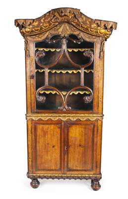 the heavily carved projecting cornice above a glazed door opening to serpentine shelves, over a pair of panel doors, raised on bun feet