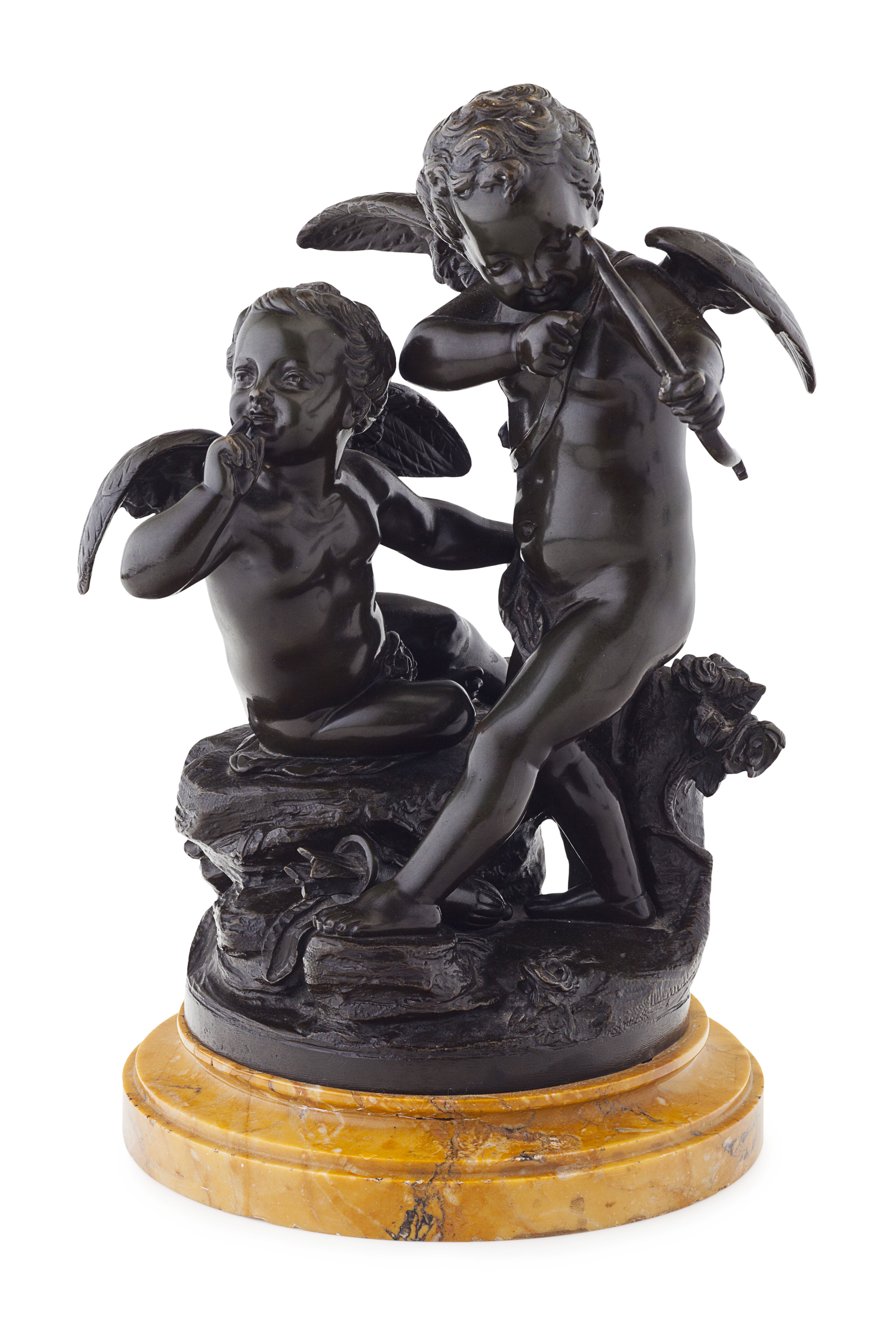 bronze, dark brown patina, modelled as a pair of winged putti, one taking aim with a bow, signed 'J. Gregoire', on a circular Sienna marble moulded base