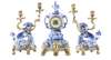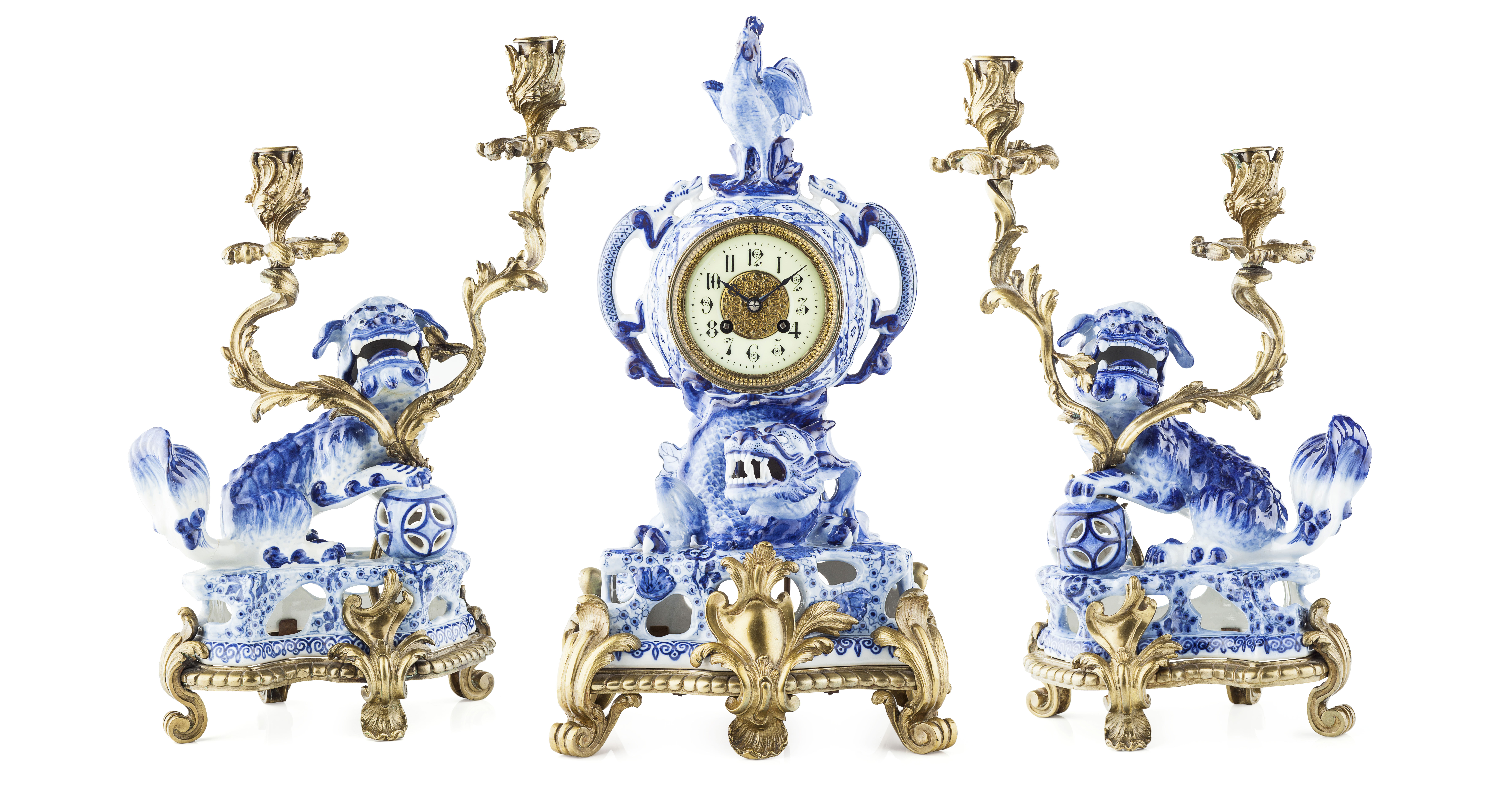 the white enamel Arabic number dial set in an elaborate blue and white glazed porcelain case with dragons, and a cockerel surmount, on a gilt bronze base, the eight day movement striking a gong; the twin branch candelabra supported by blue and white porcelain fu lions on gilt bronze bases (3)