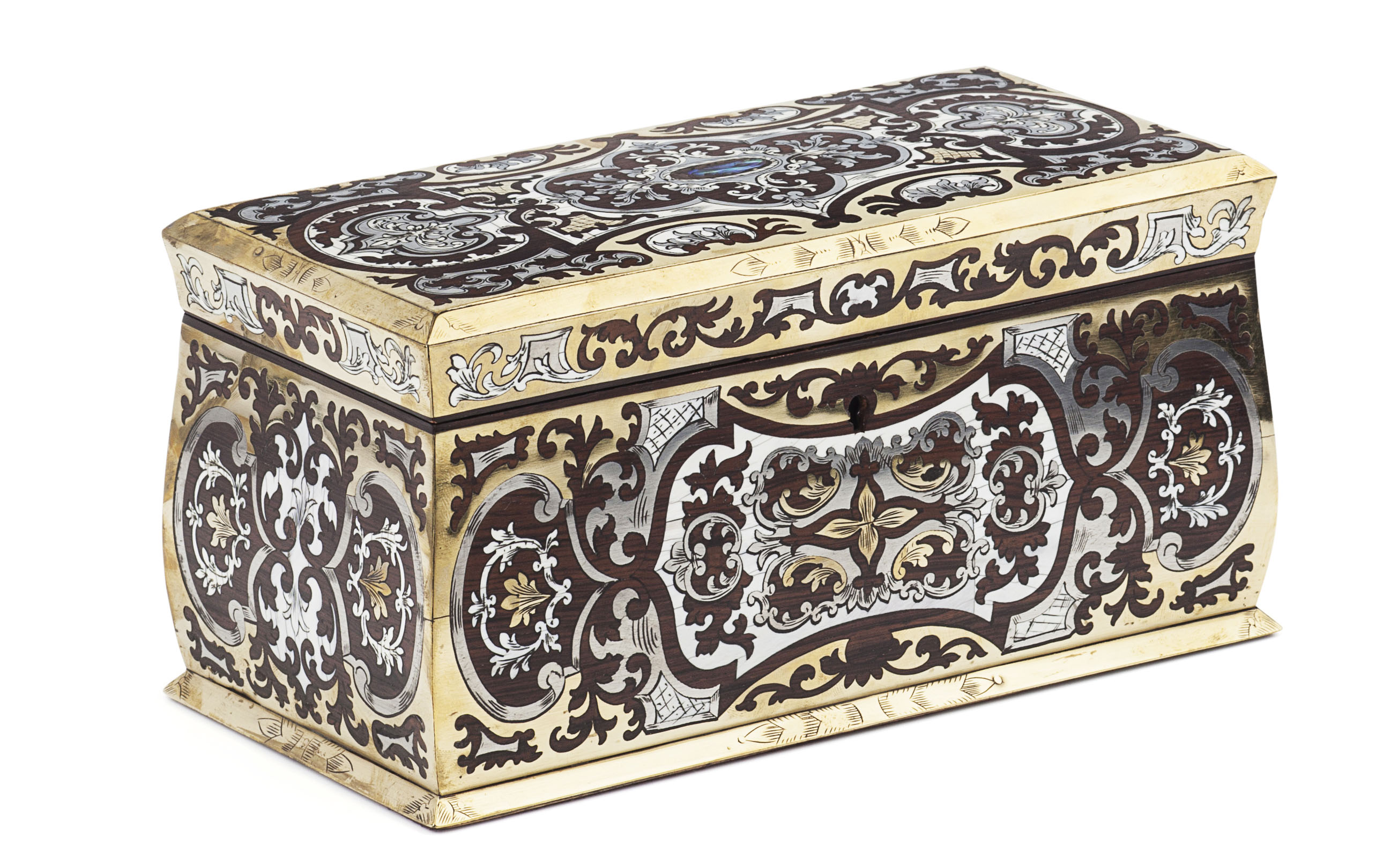 of slightly bombe form, the sides and cover richly inlaid with cartouches, strapwork, C and foliate scrolls, opening to a two covered tea wells