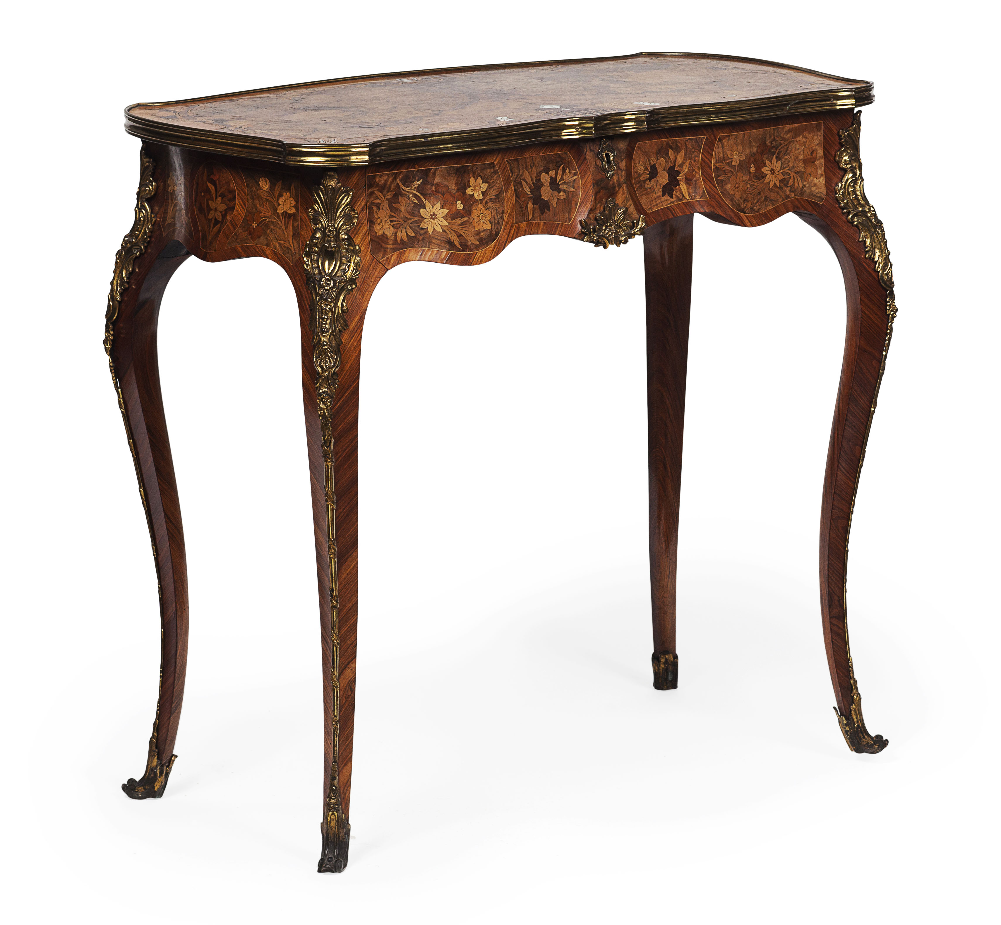 in the Louis XV style, the cartouche shaped top with a figured walnut centre and floral scrolling marquetry and tulipwood crossbanded border, above a similarly decorated shaped frieze drawer, on cabriole legs with scroll cast mounts and sabots