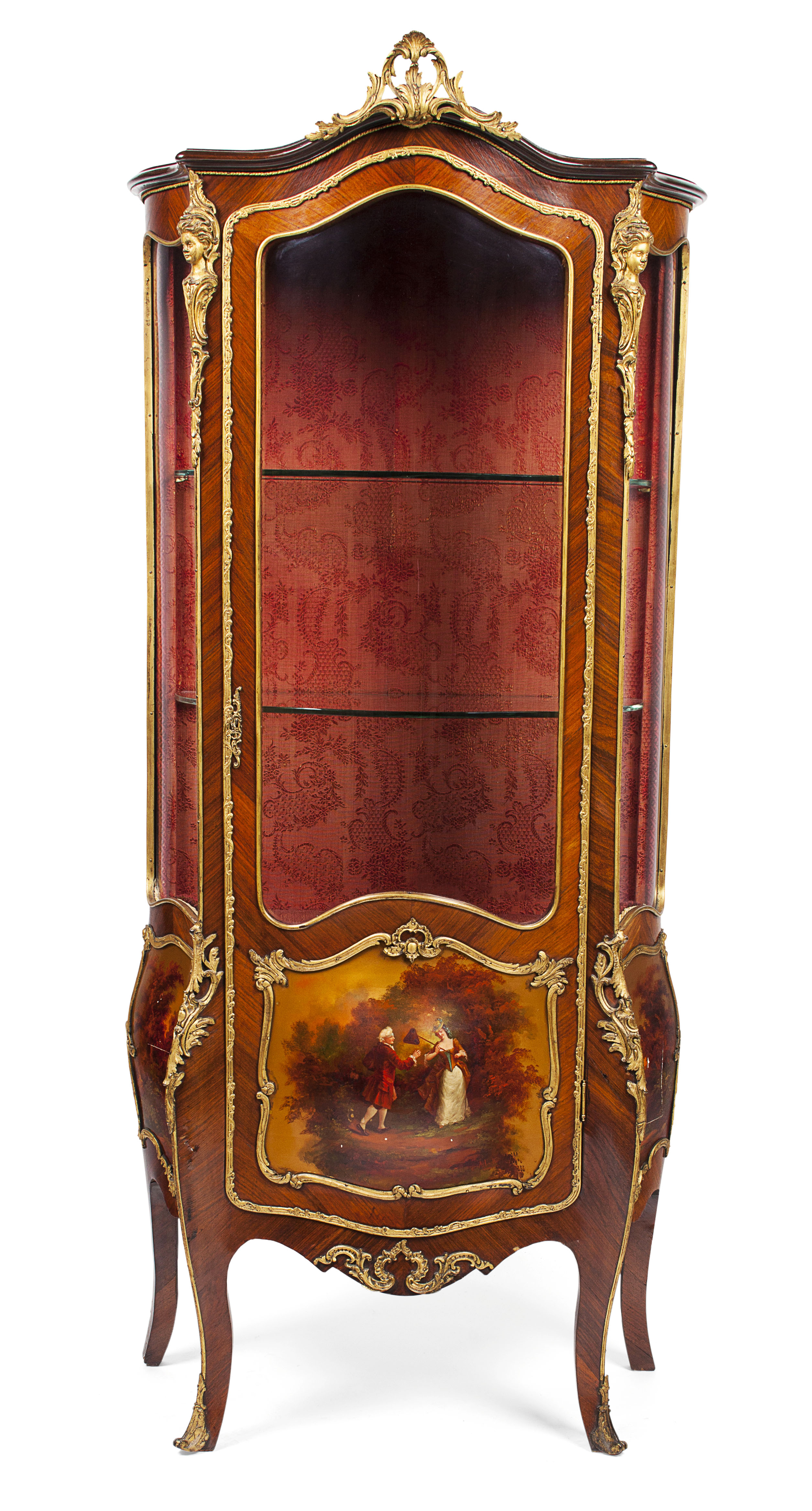 the arched cornice over a glazed serpentine door and side panels opening to glass shelves, decorated with scene depicting a courting couple and landscape views, raised on cabriole legs; the whole outlined in gilt bronze