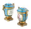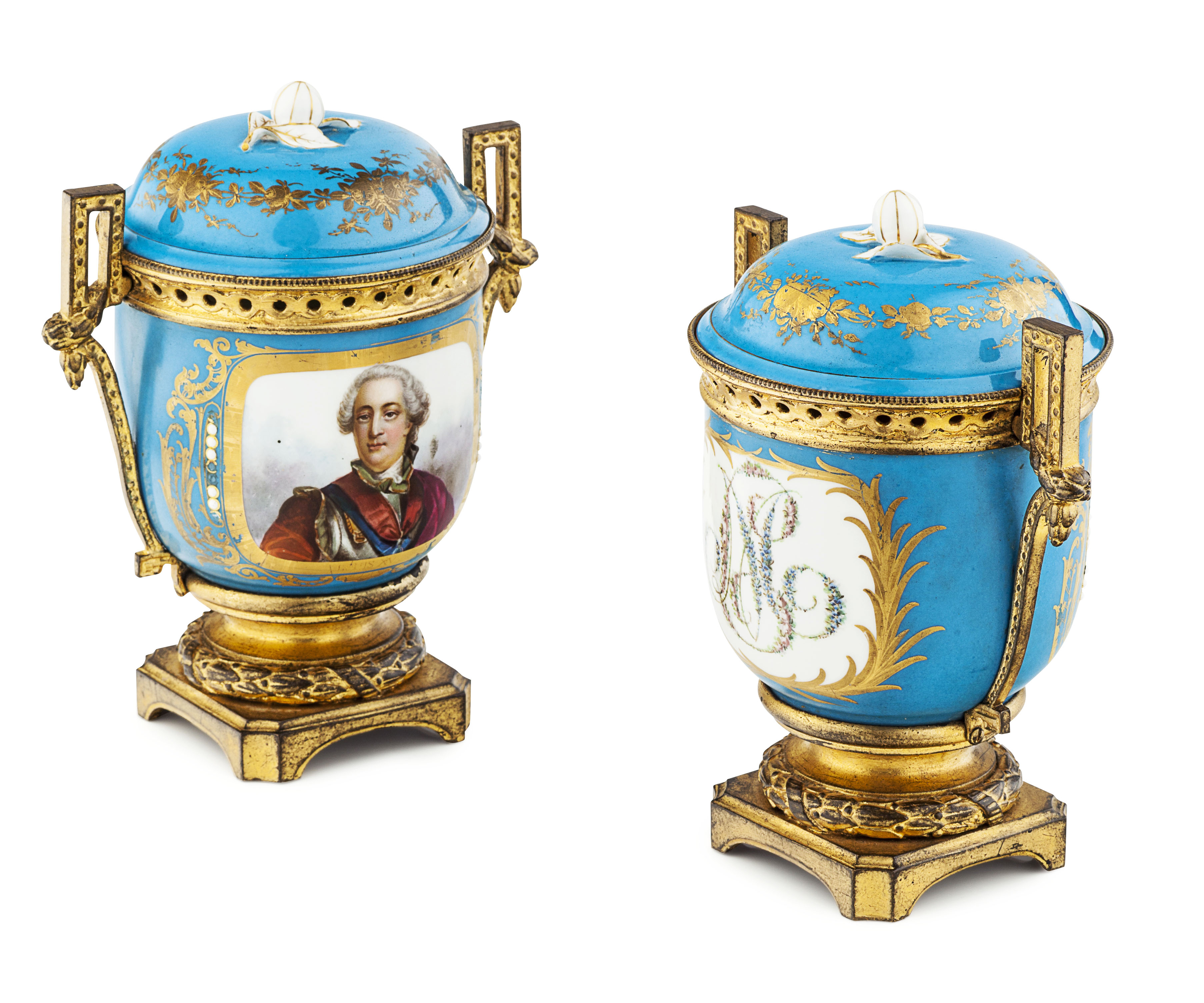 decorated with reserved portraits of Louis XV and Marie Leszczynska with monogrammed reserves opposing, against a bleu celeste ground, with gilt bronze mounts (2)